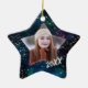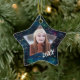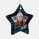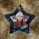 A frente deste ornamento em forma de estrela mantém a imagem do seu formando em um quadro que corresponde à forma do ornamento. O formando ano está em cinzas prateadas no fundo direito da foto, e tudo está enquadrado em um incrível universo estudado de estrelas douradas. O verso do ornamento tem o mesmo tema do universo, com a estrela central segurando seu texto personalizado em azul. Faça seu formando parecer uma estrela!