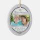 Belo aniversário de casamento do 25 Silver personalizado ornamento de fotos! Este adorável ornamento cerâmico de dois lados apresenta um design de orvalho prateado clássico, e uma área central de aparências de arte digital prateada que está pronta para você carregar sua foto em ambos os lados! Na frente lê 25 Anniversário' no topo, com os nomes dos casais, data e ano no fundo em uma elegante fonte prateada. Na parte de trás do ornamento também se lê 25 Aniversário de Prata, com "Amor" e o ano no fundo. Personalize-o com a sua foto favorita, nomes de casais e uma data nas áreas de fácil utilização do modelo nesta página. Para editar o tamanho da fonte, a cor ou o estilo simplesmente clique em 'personalizar' e essas opções também serão disponibilizadas a você. Este ornamento é um presente de excelente e uma adição de manutenção para o seu aniversário e coleção de ornamentos, ou para a família e amigos! Isto também pode ser uma ótima ideia de festa de aniversário de prata! Para mais aniversários, convites, favores, presentes e guardas, por favor visitem o nosso compro!