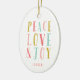 Belo personagem desenhou um ornamento de fotos de Natal com um design de tipografia caprichosa que diz Peace Love and Joy personalizado com o ano. Adicione a sua própria foto para criar a manutenção perfeita ou um presente personalizado para a sua família e amigos. Clique em Personalizar para editar fontes ou adicionar mais fotos para criar uma única design de ornamento de feriado. Um presente especial e único!