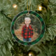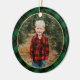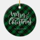 Um lindo ornamento de fotos de Natal desenhado por personalização que você pode personalizar. Adicione a sua foto de família para criar a manutenção perfeita ou o presente exclusivo para a sua família e amigos. Design apresenta um padrão de xadrez verde diagonal e o "Feliz Natal" em um roteiro manuscrito branco e sua foto personalizada no círculo do ouro. Personalize com seu nome de família e ano.