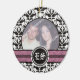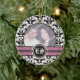 Ornamento de fotos de casamento tema damasco preto e branco com sua foto de precioso enquadrada em bandas preto e branco, preto e rosa, e suas iniciais em um círculo.