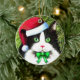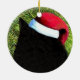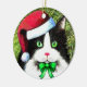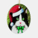 Gato preto e branco delicioso vestido de Natal. Olha para o fundo do ornamento!