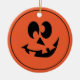 O ornamento da porcelana cerâmica da abóbora do Halloween é mostrado. O verso tem o texto Feliz Halloween. Personalize este item ou comprar como está.