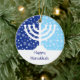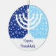 O ornamento perfeito para a família inter-religioso. Um menorah de Hanukkah é mostrado em silhueta contra um campo da obscuridade e da luz - estrelas azuis e flocos de neve. Sua mensagem personalizada vai abaixo. Igualmente podem ser usadas como o fã, as trações da luz ou das cortinas ou a decoração da parede. Disponível com produtos de harmonização.