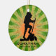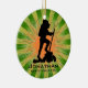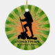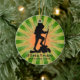Caminhando pelo Ornament Personalizado Natal 20XX contra um fundo verde e laranja de estouro. Todo texto personalizável, frente e verso!