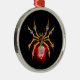 Aranha mecânica, com pá-pá de ouro, engrenagens de latão e uma lâmpada de vidro vermelha sobre fundo preto. Estilo Steampunk.