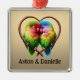 Celebrar o casal inseparável com este ornamento, que apresenta um par de aves de capoeira coloridas, geradas pela IA, abraçando-se numa tosse em forma de coração. Personalizar com nomes. Excelente como um presente de Dia de os namorados, casamento ou aniversário de casamento! Design © W.H. Sim. Mais informações em zazzle.com/word2art