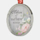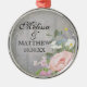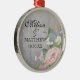 Ornamento comemorativo personalizado para lembrar o dia do seu casamento ao longo dos anos ou celebrar um aniversário significativo. Excelente para favores de casamento para vocês, familiares e amigos muito amados. O fundo quente de madeira curada de uma cerca de madeira ou de um celeiro é o pano de fundo perfeito para fazer as cores florais pop! Os enxertos, os escrotos e o florescimento com vegetação, samambaias, folhas de eucalipto, ervilhas doces, margaridas e um glorioso pénia rosa são perfeitamente elegantes. Direitos autorais, Audrey Jeanne Roberts, todos os direitos reservados.