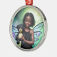 Christmas ornament. Uma pequena fada afro-americana com asas cintilantes segurando uma ursinha de arte.