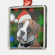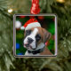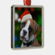 Cachorro branco e desfiladeiro veste um chapéu de Papai Noel muito pequeno e fica bonito com luzes de Natal brilhantes no cão de fundo amante o ornamento de Natal