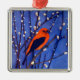 Enfeites de natal bonitos em azul e vermelho profundos. Um cardeal vermelho brilhante senta-se em um ramo do salgueiro de bichano contra um céu azul profundo