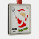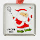 Papai Noel tocando badminton, segurando uma raquete, prestes a esmagar um passarinho. Editar texto para adicionar nome e ano.