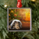 Collie fica perto da árvore de Natal e o fogo queimando no ornamento do cão de lareira