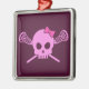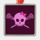 Crânio do Lacrosse com arco. Crânio temático do lacrosse legal das meninas e ossos transversais. O divertimento e o design resistente do crânio do rosa do lacrosse da mulher com cabelo curvam e cruzaram varas do lacrosse.