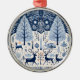 Uma bela ilustração de uma cena florestal com veados, árvores e animais numa paleta de cor azul, trabalho de arte de inspiração escandinava, padrões de folhagem detalhados, motins nórdicos tradicionais e uma casa de madeira rústica visível ao fundo. Uma borda decorativa se forma em torno de todos os elementos. A design inclui características como veados, flores silvestres, folhas, vagalumes, estrelas e pegadas de animais. Uma bela design para todas as suas festividades de Natal!