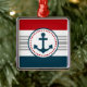 Design náutico com decoração em forma redonda com âncora sobre fundo azul, vermelho, cinza e branco listrado