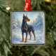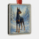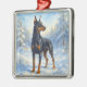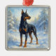 Um Doberman Pinscher elegante está orgulhoso em uma floresta nevada, sua postura de alerta e marcações marcantes contrastando lindamente com a serena paisagem de inverno.