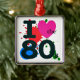 Um ornamento premium quadrado com a imagem da frase "Eu coração os anos 80" em negrito preto com um bonito coração cor-de-rosa e pancadas de tinta vermelha, verde e azul no fundo. Veja toda a coleção de Ornament Tubular 80s em TOUCHES ESPECIAIS | Seção Favoritos para festas.