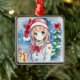 Menina de anime bonita com chapéu de Papai Noel com arco vermelho com fundo de árvore de Natal nevada.