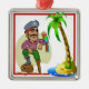 Um ornamento especial quadrado com uma imagem de um pirata de pernas de cavilha com o pé sobre um tesouro e um papagaio no braço. Ao seu lado está uma imagem de desenho de uma ilha deserta com palmeira e cocos. Veja toda a coleção de Encaminhamentos de Naufrágio nos TOUCHES ESPECIAIS | Seção Favoritos para festas.