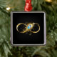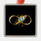 Símbolo Dourado e brilhante do infinito, decorado com pena de joalharia de pavão com turquesa sobre fundo preto.
