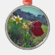 Fada com asas vermelhas e vestido roxo Cheirando no amarelo Daffodils Flores Fadas e Foto pelo artista Sandy Closs Fairy, fadas, píxias, píxias, fantasia, flores, borboletas, vermelho, amarelo, roxo, conto de fadas primavera, feira
