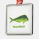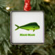 Este ornamento de pesca ao largo apresenta o peixe mahi mahi, também conhecido como golfinho ou dorado. Um peixe de cor clara, mahi mahi, é encontrado em correntes oceânicas quentes, frequentemente perto de ervas daninhas ou outros detritos flutuantes. Mahi mostra uma incrível variedade de cores, incluindo blues neon, verdes brilhantes, amarelos brilhantes e diferentes tons de ouro.