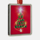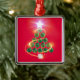 Esta árvore de Natal é especial, pois é projetada com uma colagem de esferas de malaquite com uma base de cristal de quartzo e uma estrela de cristal de quarts em cima. Grelha de ouro cintilante em volta da árvore em um fundo vermelho.