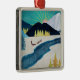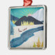 Uma paisagem digital com cores brilhantes e texturas mostrando um cogumelo com uma equipe de trenó de cão e um sol cor-de-rosa brilhante em tons de azul, ouro, ciano e amarelo.