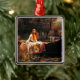 Ornamento com a pintura a óleo de John William Waterhouse The Lady of Shalott (1888). Uma bela mulher de vestido branco escapa num barco do seu destino olhar para todo o mundo através de um espelho e tecer uma tapeçaria dele — mas ao ver o Príncipe Lancelot, a maldição segue a Senhora de Shalott até ao seu fim. As cores brilhantes do outono pintam esta cena trágica. Um presente inspirador para os entusiastas de Arthuriana e os coletores de pré-raphaelite.