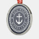 Um presente perfeito para os donos de barcos, este Enfeites de natal náutico bonitinho em azul-marinho clássico e branco mostra o ditado "velejar mais, menos se preocupar" curvo em torno de uma ilustração branca da âncora, acentuado com detalhes náuticos.