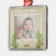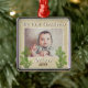 O Primeiro Ornamento Festivo Russo de Natal do Bebê. Enfeites de natal de fotos russo para uma menina ou um bebê. O design tem uma foto e ramificações de pínus em um fundo bege rústico com flocos de neve brancos. Personalize-o com a foto, o nome e o ano de nascimento do seu bebê.