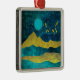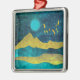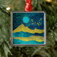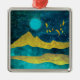 design de paisagem da montanha abstrato em tons de ouro, ciano e azul em tons negros, com um nascer, estrelas e pássaros.