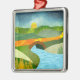 Cena de abstrato de um rio que passa por uma ponte de pedra com colinas rolantes e uma estrada de ouro em cores e texturas ousadas.