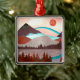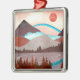 Paisagem de montanha em vermelho e azul com um lago e um arco-íris azul arrojado.