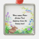 Este design apresenta um coelho marrom como Peter Cotton Tail. Ele está sentado numa cama de verdes e flores moldadas num sapato de cavalo. As flores azuis, verdes, roxas e amarelas estão floridas e no topo está um pássaro poleirado em uma vinha de flores. Estes ornamentos estão datados no verso em alguns estilos. Coloque todas as suas próprias informações neste ornamento. Disponível em estilos sorvidos.