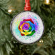 Rosa grande e florescente com pétalas arco-íris sobre fundo branco, pintadas com pedaços de tinta colorida e brilhante. 3d
