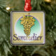 A ilustração original deste Ornamento apresenta um ouro de uvas. Um pino de ouro como este é vestido por um sommelier. Um sommelier, ou adestrador de vinho, é um profissional de vinho experiente e experiente que se especializa em todos os aspectos do serviço de vinho, bem como no emparelhamento de vinho e comidas. Nessa ilustração, as uvas iluminam as letras roxas profundas "sommelier", como o sol dos vinhedos. Uma forma verde redonda ecoa a garrafa de vinho e os verdes e as profundezas vermelhos da vinha. Um fundo texturizado de cortiça envolve a cena.