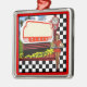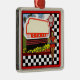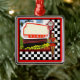 Ornamento premium quadrado com uma imagem de um sinal de retro diner personalizável, relógio de diner vermelho e uma imagem de 50 vintage de um servidor fêmea em um quadro de xadrez preto e branco. Veja toda a coleção Nifty 50 Ornament nos TOUCHES ESPECIAIS | Seção Favoritos para festas.
