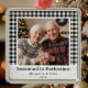 Um adorável ornamento de metal quadrado com uma borda de verificação de búfalos preto-e-branco, bar de legenda de madeira branca e estrutura de fotos centralizada. A manchete diz "Sagrado a Perfeição", com espaço abaixo para nomes e anos. A aconchegante casa de fazenda aparenta retratos de férias e faz um grande esforço para vovó e vovô — ou qualquer casal de marco. Atualize os nomes/ano e adicione sua foto favorita para criar um eterno para a árvore ou uma caixa de presentes.