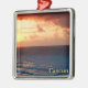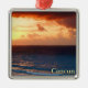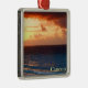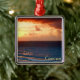 Um ornamento prateado com uma imagem de uma aquarela pintada por um belo nascer do sol vermelho e dourado sobre o oceano em Cancun, Quintana Roo, México. Veja a coleção inteira do México Ornament na seção HOME.