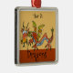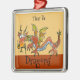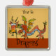 Uma ilustração de dragão de desenho animado balístico neste ornamento de metal quadrado pendurado está em castanhos, dourados, laranja, com um azul pálido embaixo. Você pode editar texto para criar seu próprio presente personalizado. Precisa de ajuda, envie um email para lilly@lillyarts.com