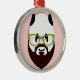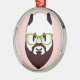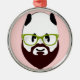 Um urso panda preto e branco vestindo óculos verdes. O panda tem barba marrom e bigode. O fundo é um círculo cor-de-rosa. Uma design hipster divertida, engraçada, humorística.
