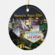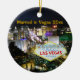 Personalize este enfeite de árvore de Natal de Las Vegas com o ano do seu casamento (ou o próximo casamento para presente como presente para os recém-casados). Design apresenta uma fotografia aérea noturna da famosa "Strip" com marcos icônicos, assim como o famoso neon bem-vindo ao fabuloso sinal de Las Vegas.