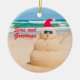 Um Enfeites de natal bonito com boneco de neve e chapéu de santa em uma praia tropical. Desejos calorosos para os feriados e os Mares e Saudações!