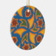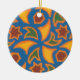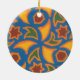 Um ornamento redondo com um design islâmico tradicional em laranja, ouro amarelo, marrom e verde sobre um fundo azul brilhante de uma tela de Judy Adamson