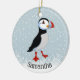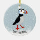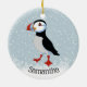 Ornamento de Puffin em fundo de neve, com texto personalizável em ambos os lados.