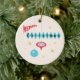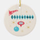 Estilo retrô de Natal Saudação com a mensagem "Feliz Natal" e um gráfico de vários ornamentos de árvores que foram populares na década de 1950.