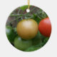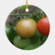 Este ornamento bonito ao estilo do pente apresenta uma fotografia de um monte de tomate amadurecido, incluindo um tomate vermelho, laranja e verde de cereja em uma linha, crescendo em uma planta de tomate em um jardim suburbano. A fotografia foi tirada usando macro fotografia para um resultado detalhado.