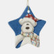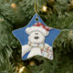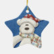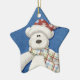 Um urso polar com um cachecol xadrez e ornamento boné vermelho e branco com floco de neve.